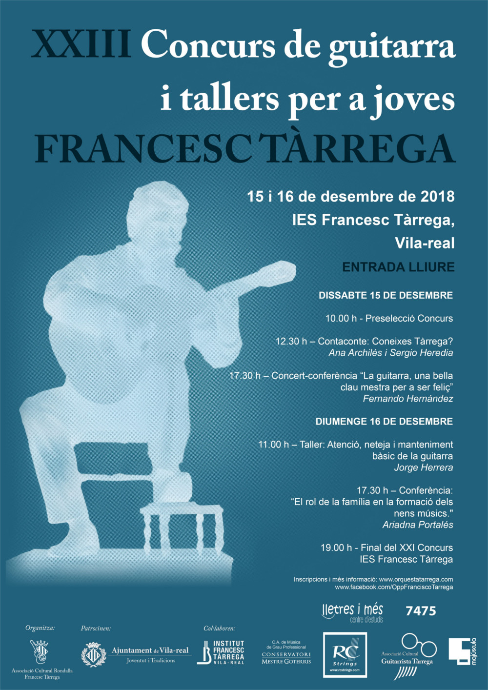 L’Associació Cultural Rondalla Francesc Tàrrega i l’institut de secundària Francesc Tàrrega de Vila-real, conscients de la necessitat de promoure activitats extraacadèmiques per als joves, acorden celebrar el XXIII Concurs de guitarra per a joves, així com els tallers musicals de guitarra Francesc Tàrrega, durant els dies 15 i 16 de desembre de 2018.